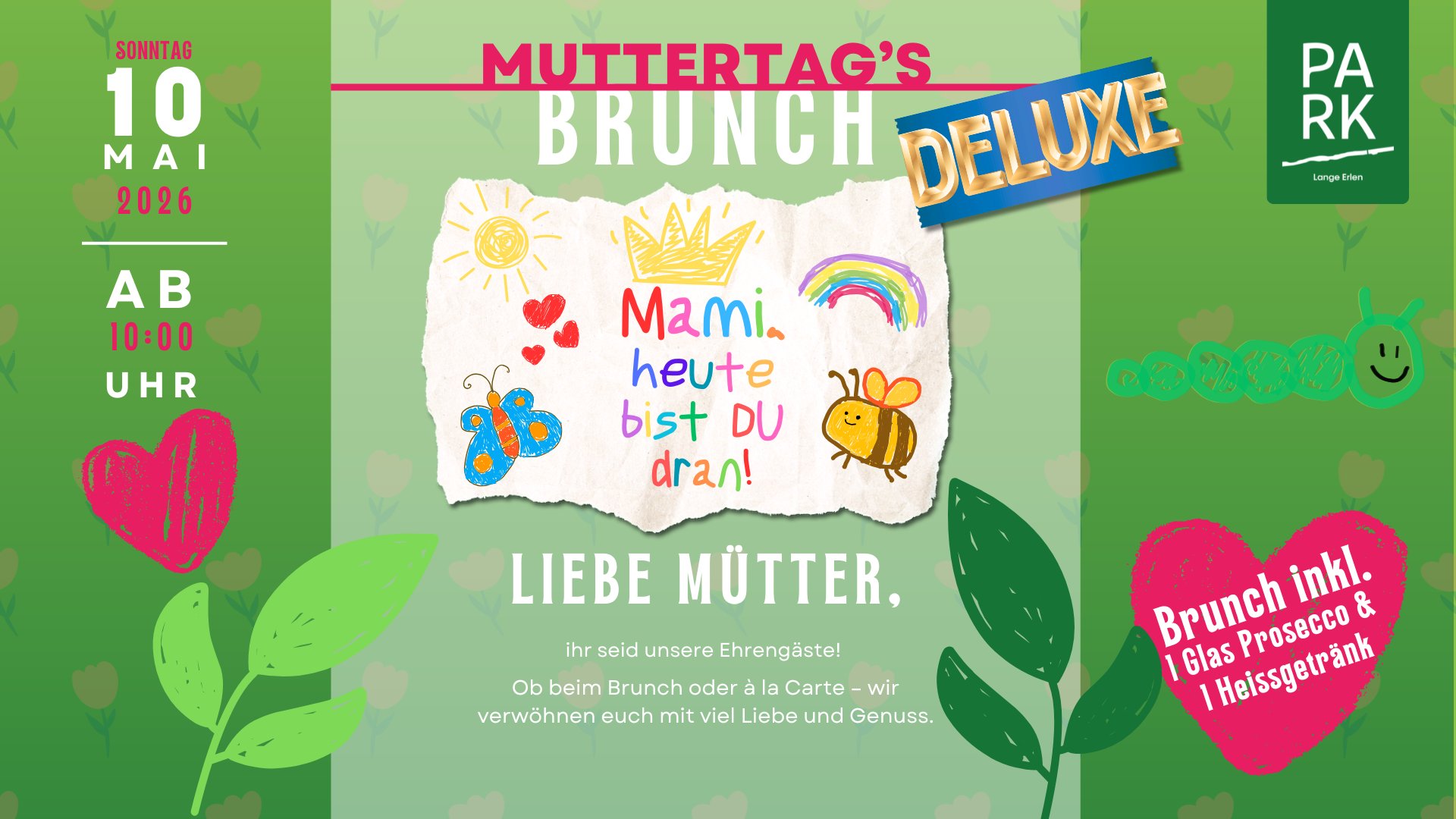 Gönnt euch sonntags eine Auszeit der besonderen Art! Wir laden euch herzlich ein, im PARK unseren exquisiten Sonntagsbrunch zu entdecken, der jeden zweiten Sonntag des Monats von 10 bis 14 Uhr stattfindet. Unser Brunch bietet eine grosse Auswahl an Köstlichkeiten – von frischem Gebäck und Müsli bis hin zu feinen Eierspeisen, frischen Früchten und vielem mehr –...